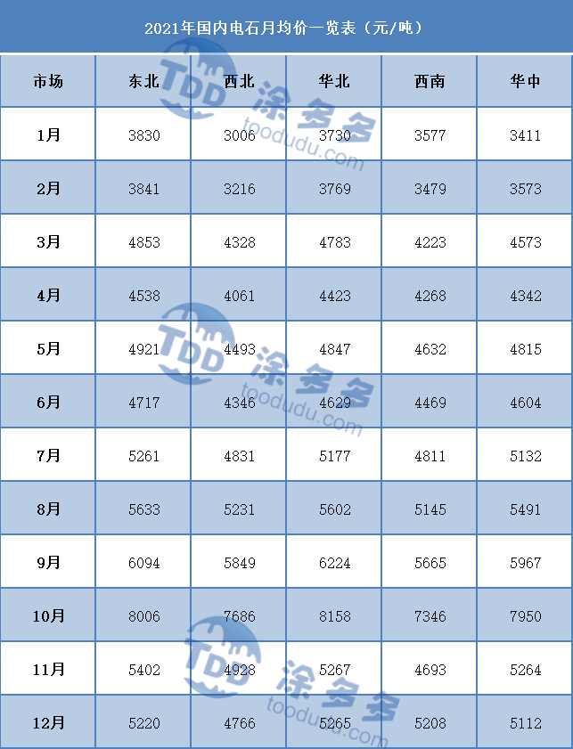 从表 2可以看出:2021年国内电石价格的高光时刻是10月份,其中华北地区月均价最高为8158元/吨;1月是低谷时期,其中西北地区月均价最低为3006元/吨。